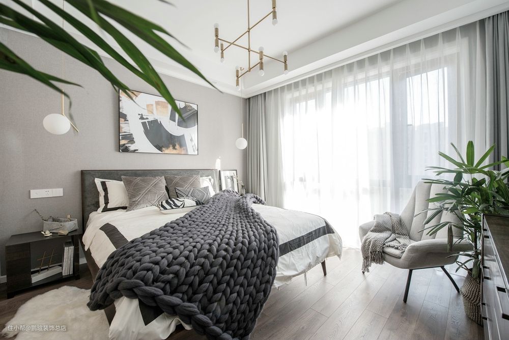 主卧的色调更显简约温馨,灰色布艺沙发搭配了白色床品,柔软舒适,为业主一家带来良好的睡眠体验;
