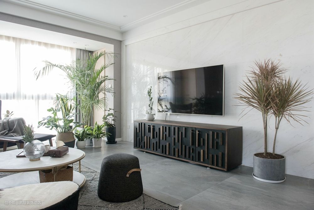 电视背景墙没有采用花哨的设计,而是用白色仿石面料通铺,将电视直接挂在墙上的设计,也显得丝毫没有视觉负担。