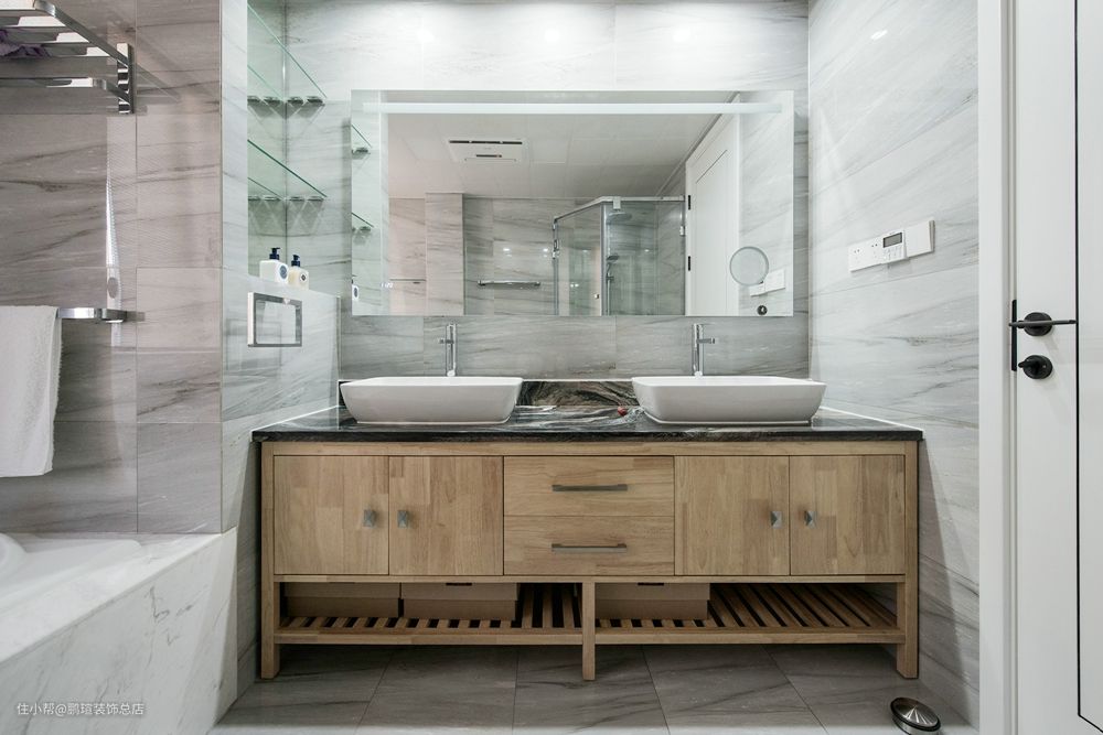 其中的浴室柜打造成双边设计,能供业主夫妻两人同时使用,非常的便利。下层的双边收纳柜,可以满足两人各自的储物需求,区别放置,拿取更加方便。