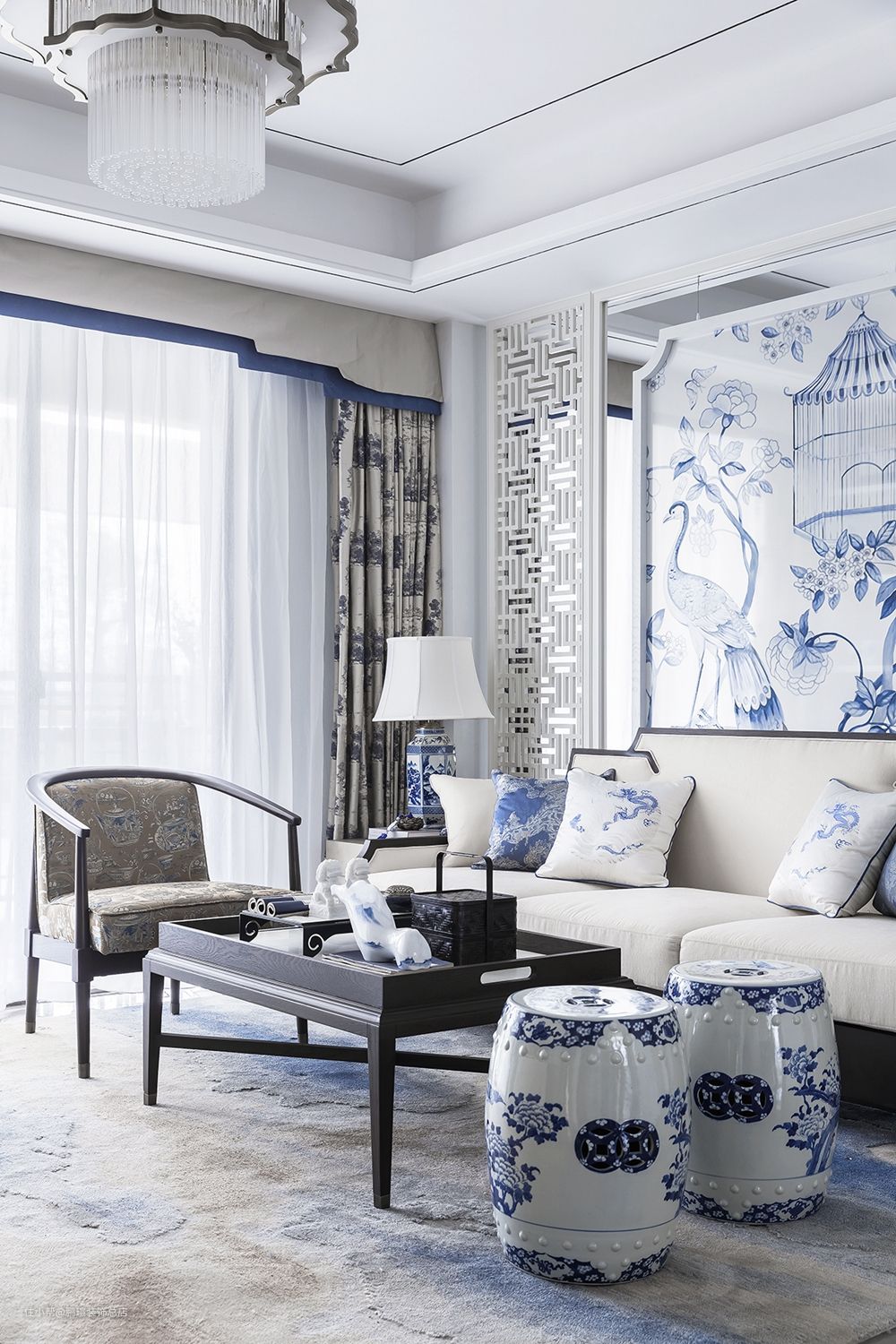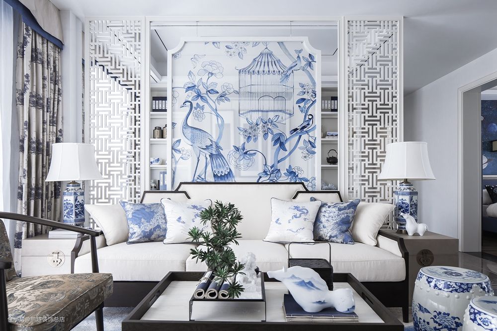 沙发背靠白色镂空隔断屏风,中部以青花孔雀绘图进行装饰,亦古亦今,格调非常优雅。