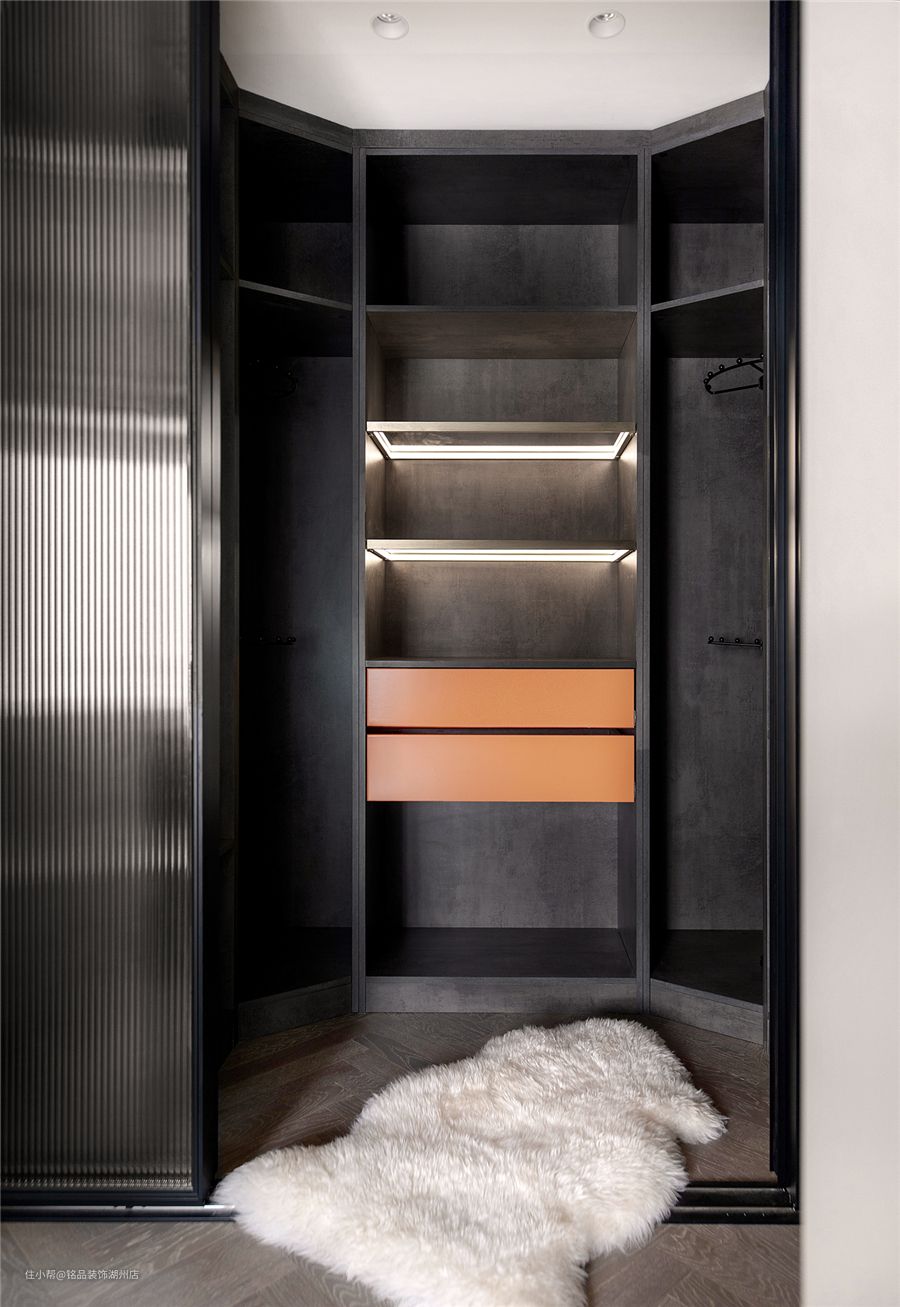 还有一种比较节省空间的办法,就是用玻璃隔断隔出衣帽间,不用打柜子,衣架直接吊在天花板上,底下可以定制格架或抽屉柜。