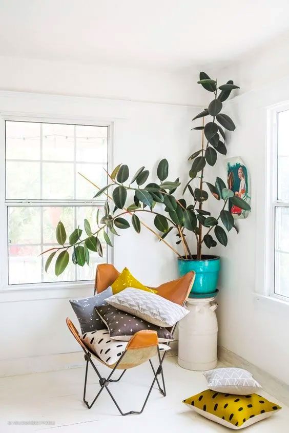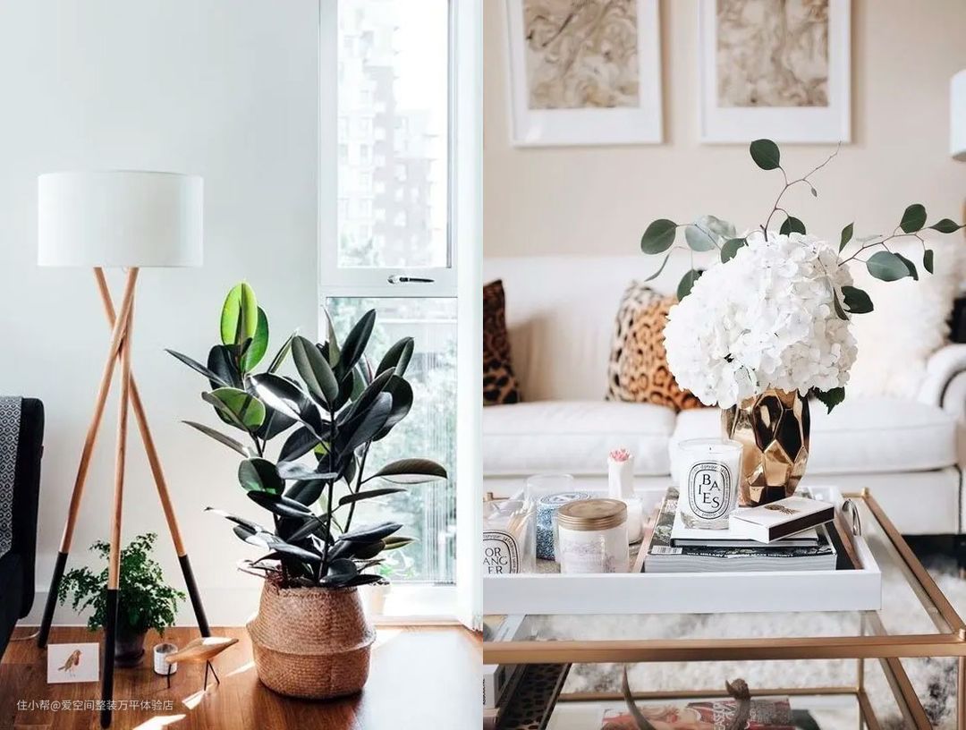 适合风格:北欧、简约橡皮树优点:它能够吸收甲醛、二氧化碳,释放氧气,让空气会变得清新,观赏性强绿植搭配:橡皮树+绣球花