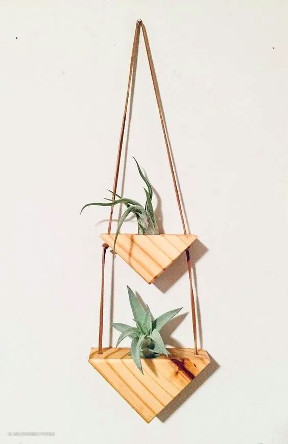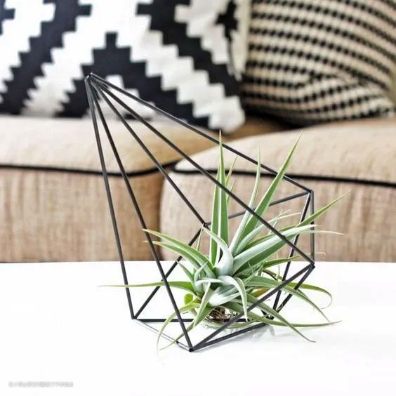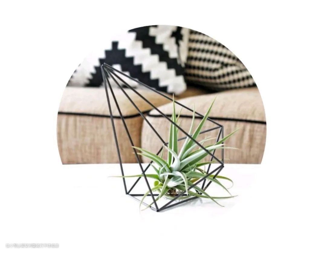 体积比较小巧的空气凤梨配上几何图形的养植容器里显得非常高级,玻璃瓶和原木托盘也是绝配,家中搭配悬挂式较多,放在桌子上观赏性差一些。