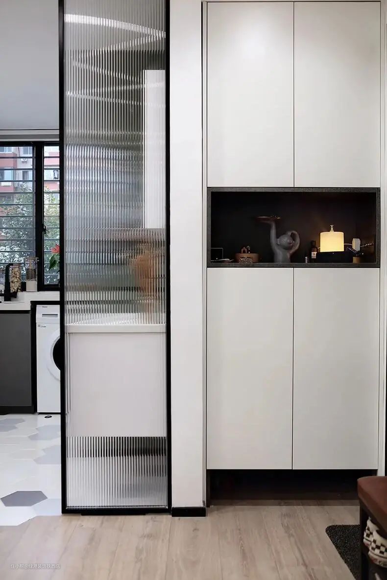 进门右侧靠墙定制了到顶的玄关柜,左侧放置一个隔层鞋架还能当换鞋凳使用,一举多得。