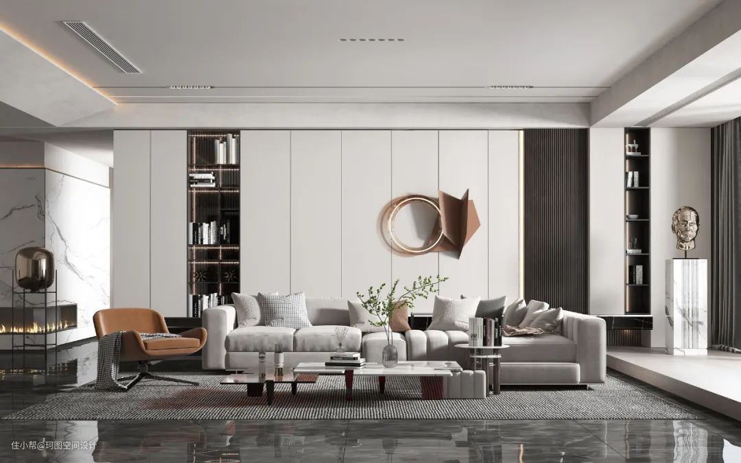 - 定制柜体作为沙发背景墙,错落有致的层板叠加,诠释出丰富而灵动的格调美学,完美契合了高定居所需求,也为空间的整洁提供了充足的收纳保障。
