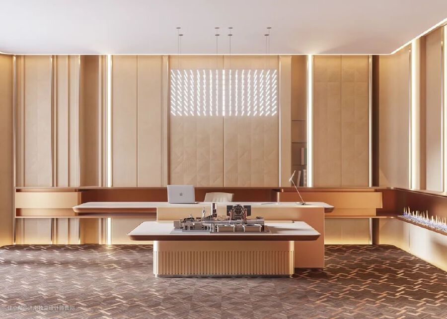 这个金色的办公空间是精致的最高境界。巨大的房间里,在质感十足的瓷砖和品味高雅的墙面镶板的衬托下,一张气势恢宏的办公桌设计占据了主导地位。