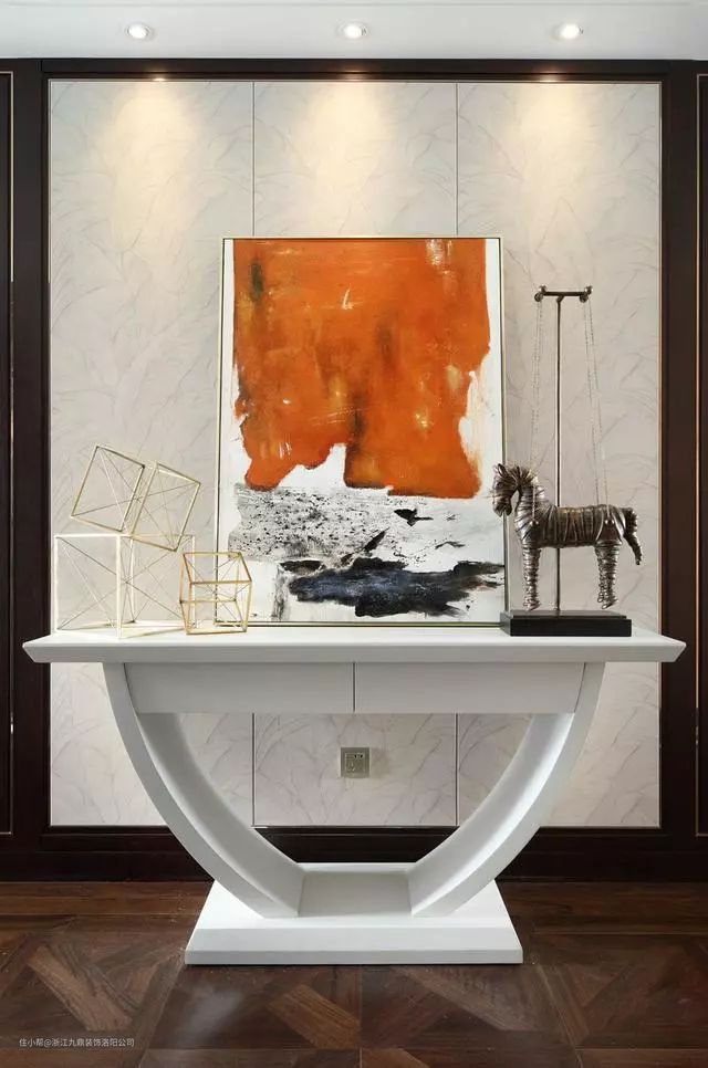 入户玄关,带着浅色花卉图案的硬包背景,将现代高端材质与绘画艺术完美交融,低调之中又不失高级。那一幅肆意泼墨的装饰画,爱马仕橙与中式水墨的不期而遇,光焰万丈,气场全开。