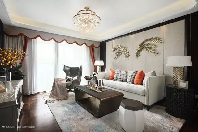 爱马仕橙镶边的波浪纹窗幔,在奢华优雅的水晶吊灯下,宛如翩翩起舞的少女,何其曼妙动人。