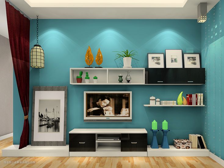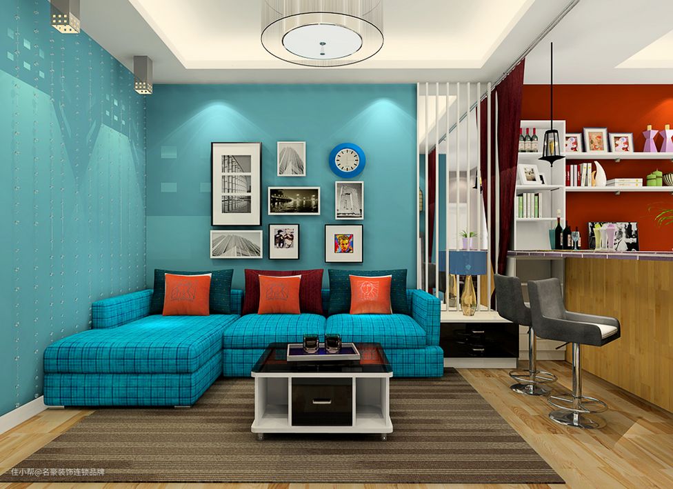客厅的蓝色电视背景墙是这个客厅装修的一大亮点,背景墙上采用原木制的壁灯,客厅的布艺沙发扶手也采用蓝色的设计和整个背景墙相呼应,让整个客厅看起来是更加的清爽宜人!