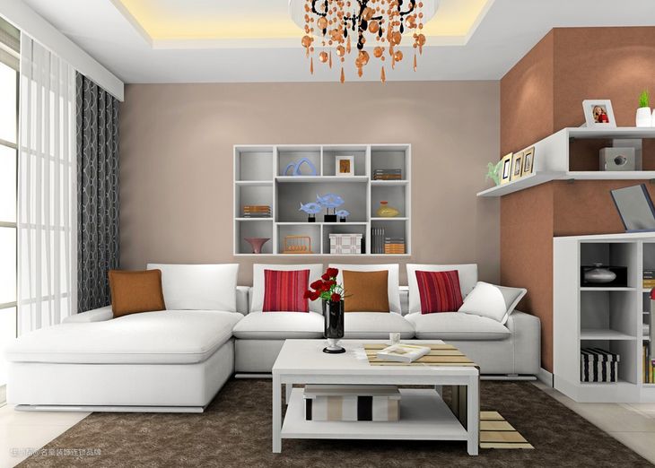 在客厅中在布置上白色的沙发,沙发可以配上带有小碎花、粉色等清新色调的抱枕,地面铺上简单的深蓝色地毯,这样就完成了简单的布置了。