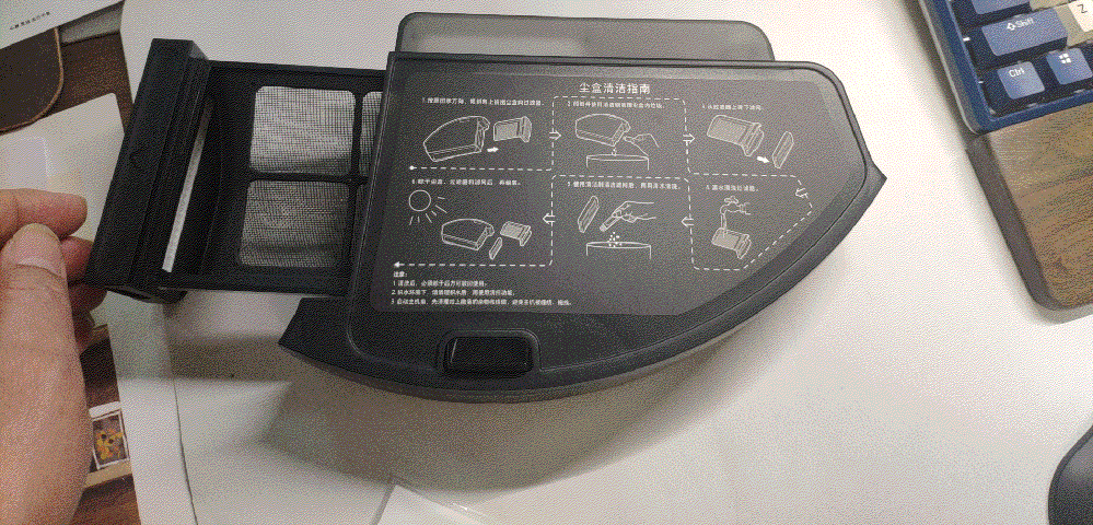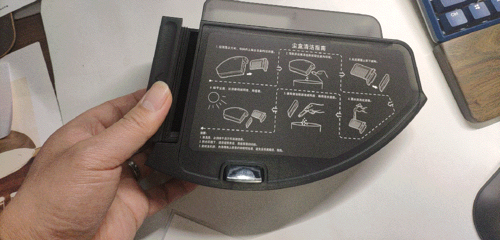 尘盒内部同样带有过滤装置,避免进入扫地机的粉尘颗粒物散发到空气中造成二次污染。安装和拆解都比较方便。
