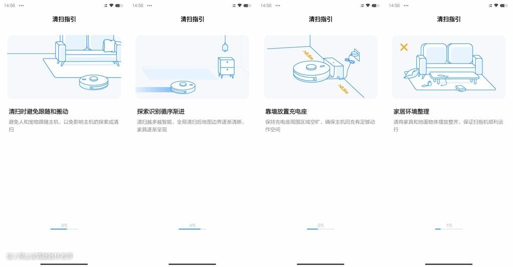 第一次连接APP会出现清扫前的准备,由于第一次扫地机需要识别清扫面积并构建地图,所以在第一次清扫的最好的将家里的杂物收拾一下,避免物体缠绕造成地图丢失或者是清扫中断。