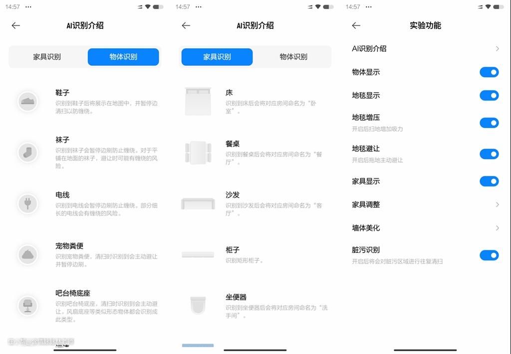 这里要强调一下米家扫拖一体机的AI识别功能,AI识别可以识别家具,鞋子,袜子,电线等等。