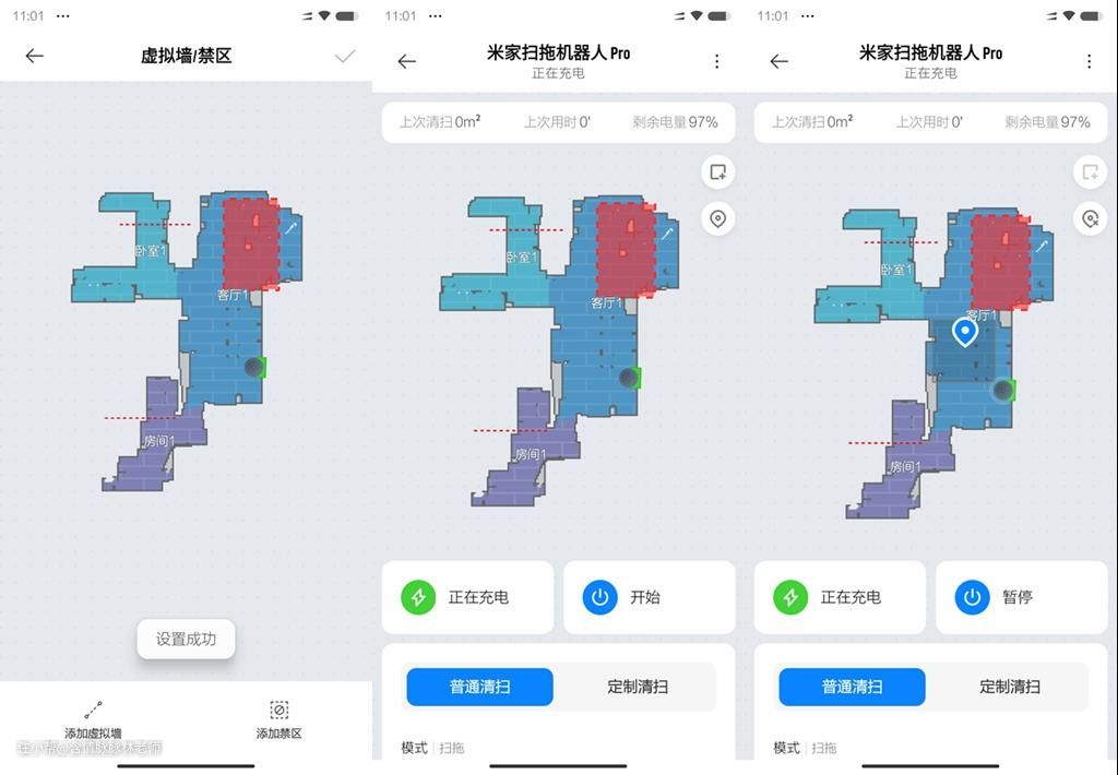 地图构建之后可以设置拖地禁区,虚拟墙,清扫禁区。我把电脑桌下面容易卡住扫地机的地方设置为清扫禁区。同时也支持划区清扫,全局清扫,选区清扫等模式。