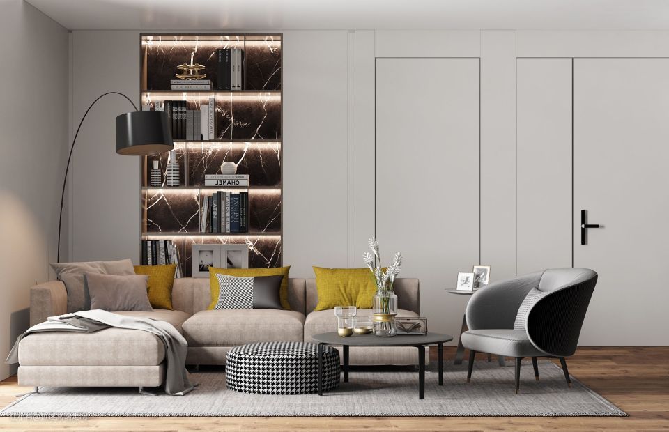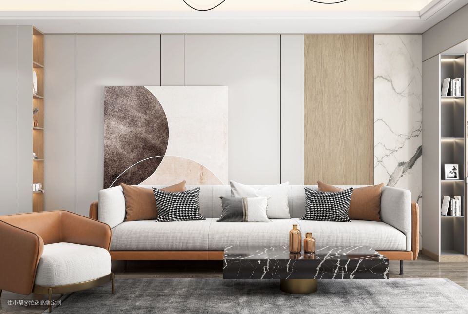 或者客厅另一角,沙发作为小隔断设计了一方阅读角,丰富沙发背景墙,内置灯带晕染书香,自然纹理美化空间增加储物力。倚在沙发一角沉浸书海,惬意休闲。