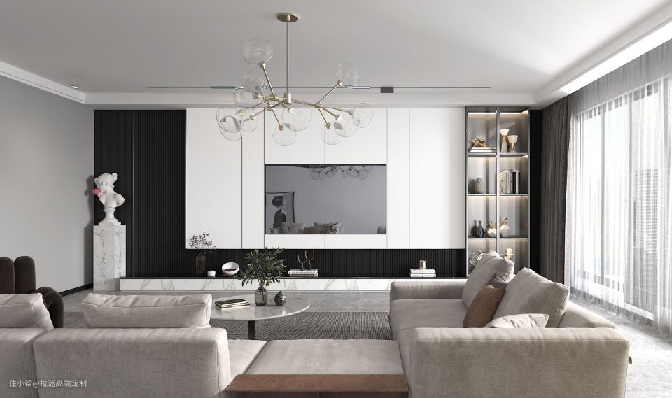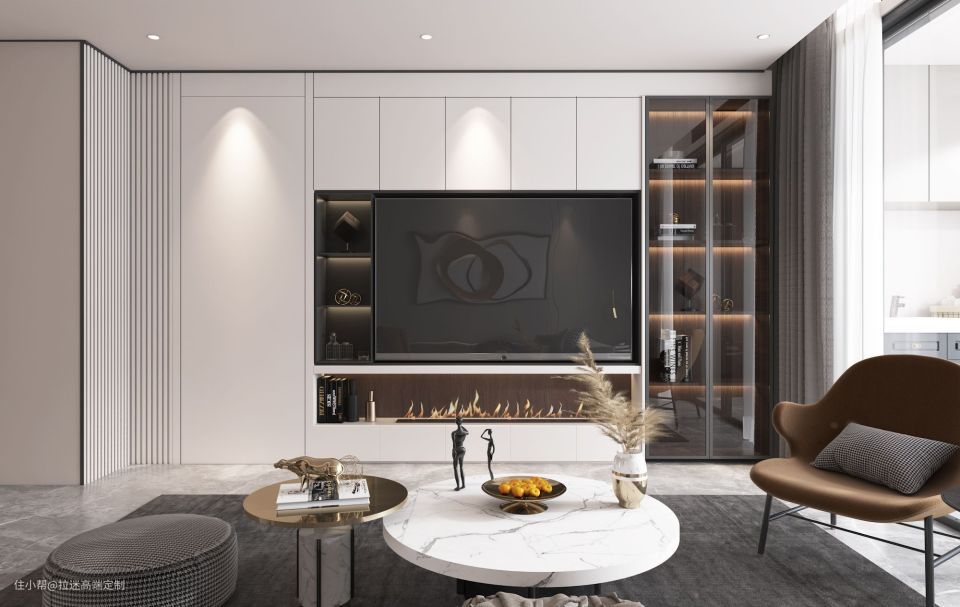 客厅利用电视背景墙定制满墙柜,嵌入式设计一个玻璃展示柜,玻璃质感加金属边框,做一处阅读角,轻奢静谧感十足。圆形茶几搭配方正沙发更有空间感,让生活充满情调与惊喜。