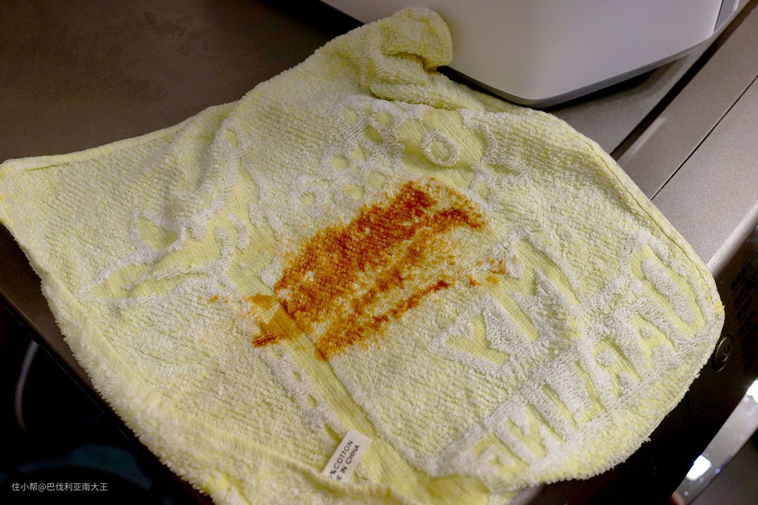 最后上终极测试,涂满了各种番茄酱的小方巾,咱们选择觉飞的高温煮洗模式。