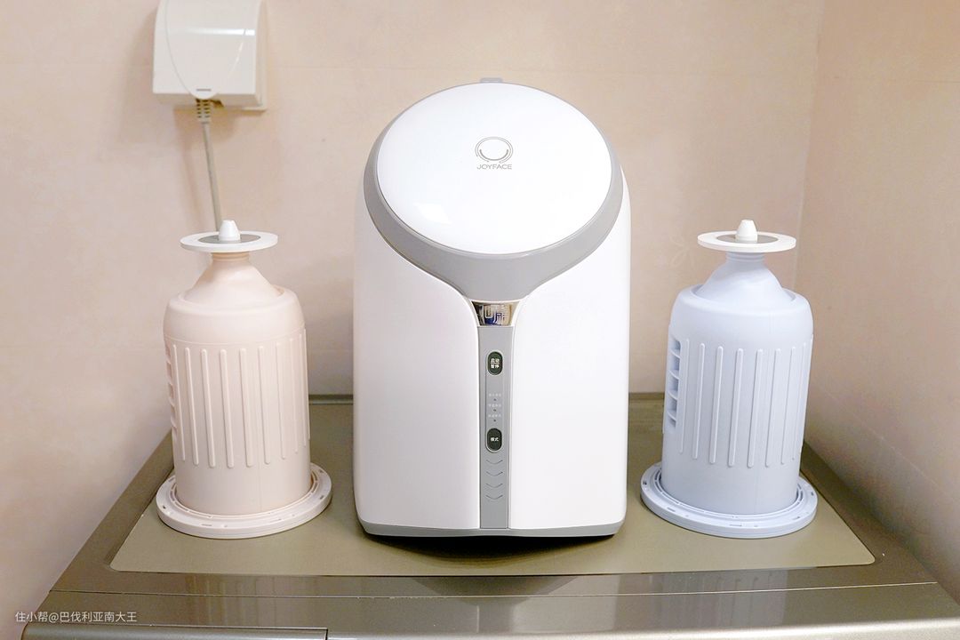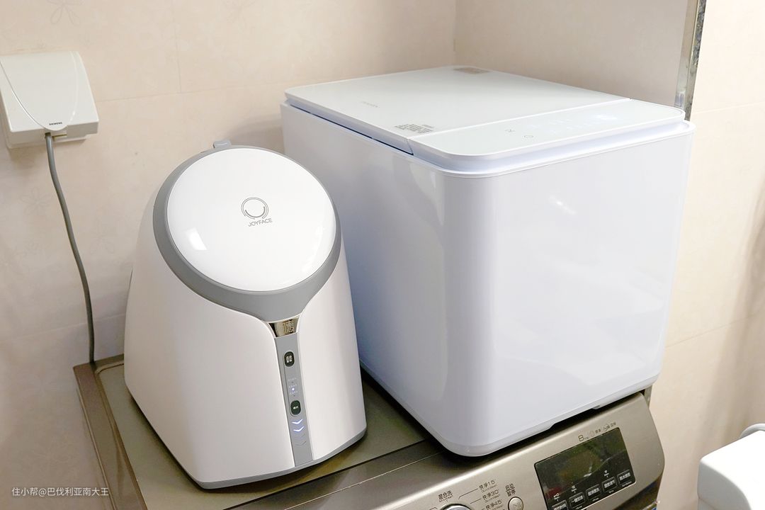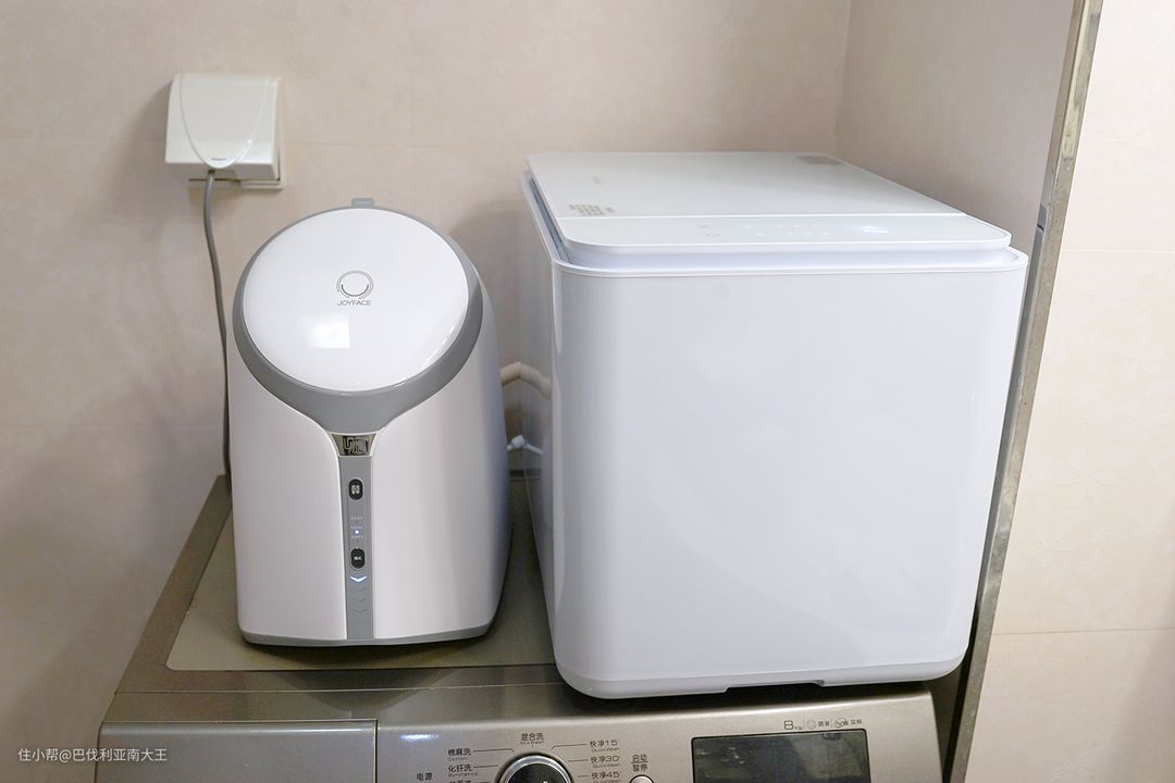 左边小一点的是觉飞,整体尺寸327X343X243mm,重量仅5KG,妹子搬起来也很轻松~旁边大的就是minibaby,313X315X445mm,净重15KG,大且沉,洗衣机上放个它基本就没空间了。