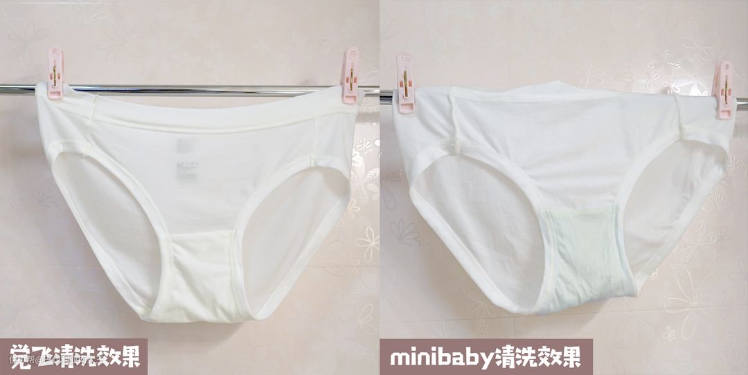 两条白色内裤都被楼主撒上了蓝色墨水,并且风干了10分钟,然后放进觉飞和minibaby洗衣机中清洗。