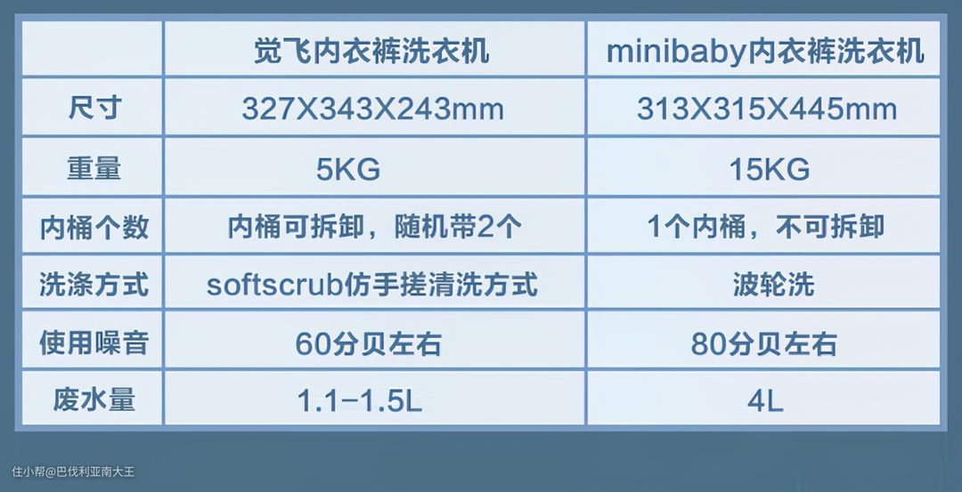 最后楼主总结了一张表格,帮大家更直观的看到这两款内衣裤洗衣机间的对比,方便选择适合自己的。