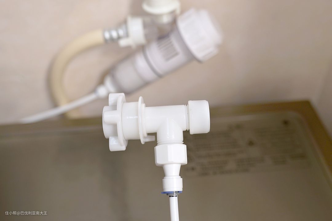 minibaby同样也是连接这三个地方,这个就是它的进水三通转接头,和觉飞家庭版比起来,少了软水过滤功能,整体细节做工也有很大进步空间。