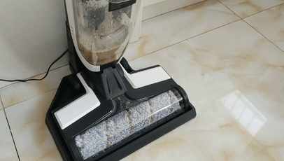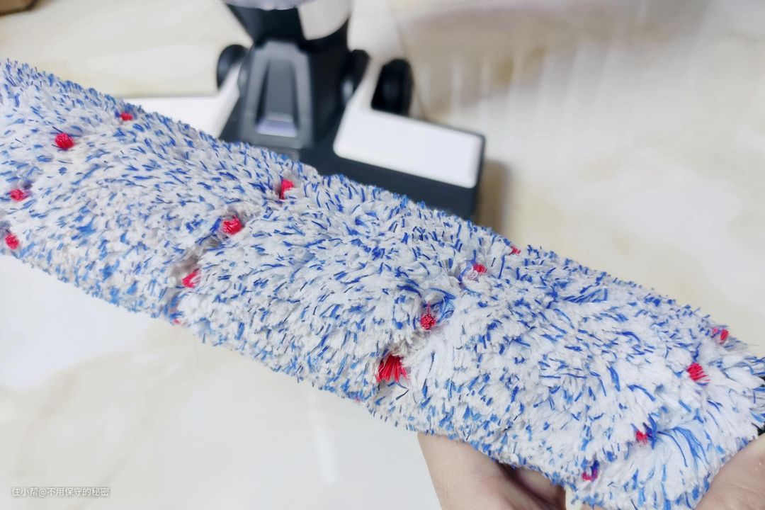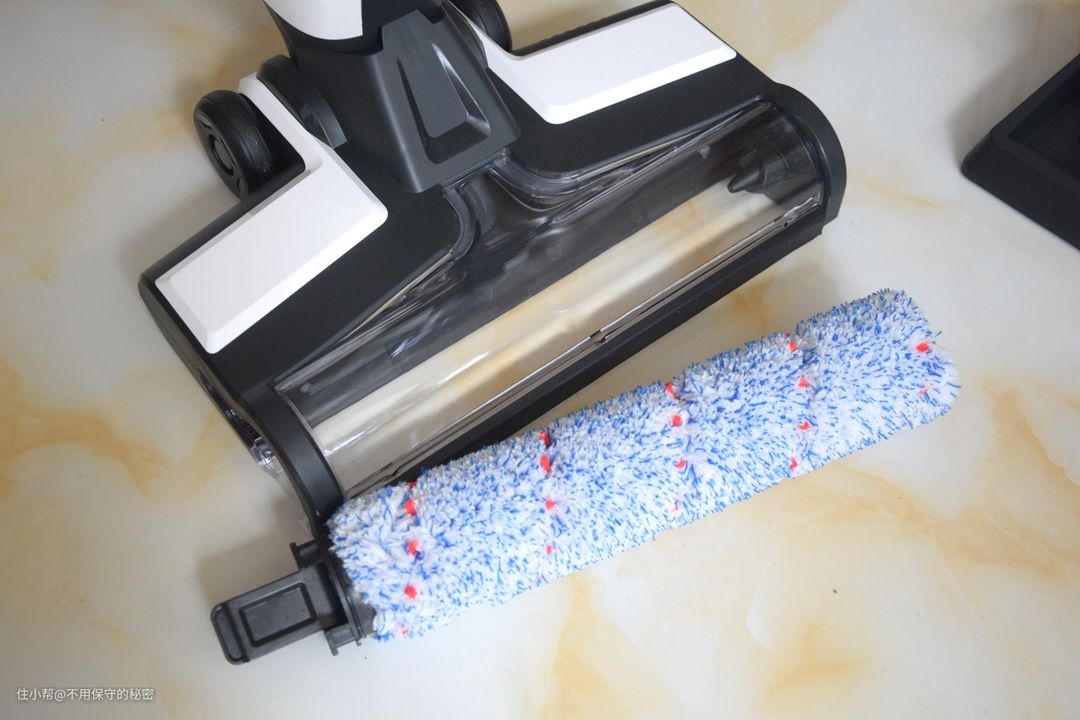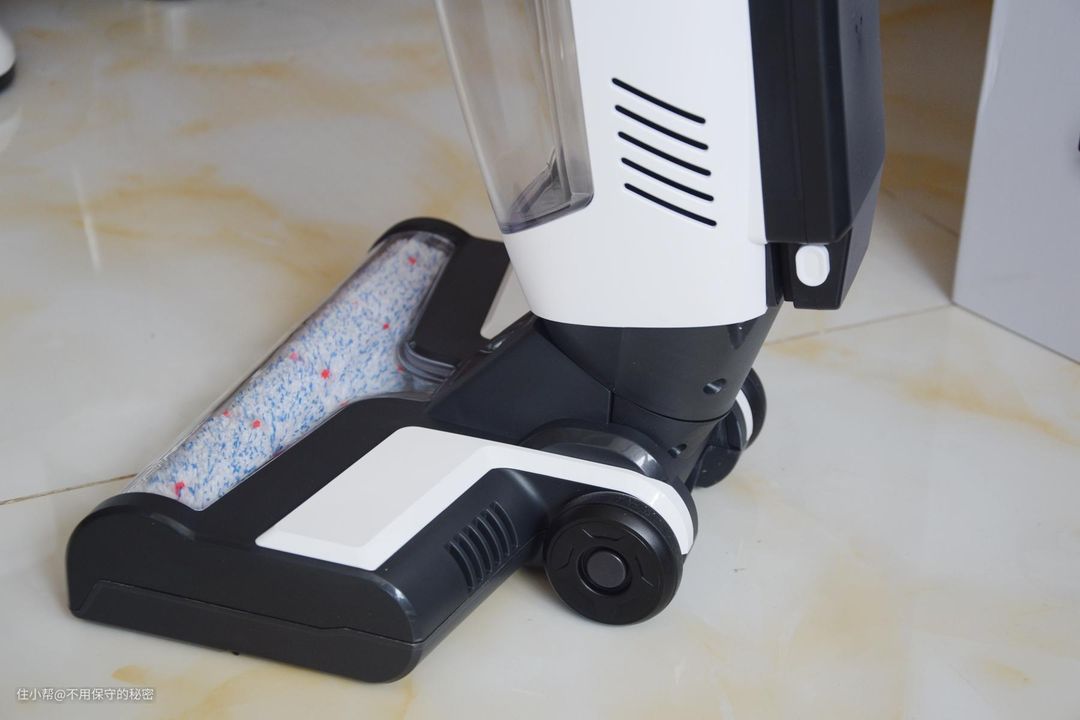 滚刷是复合滚刷,两种绒毛组成,软硬结合,有着强效吸水的特点,在使用的时候不管是顽固污渍还是毛发,灰尘均能轻松清理干净。洗地机的底部后面有两个大滚轮,方便向前推动,使用不费力,非常适合我这种懒人。