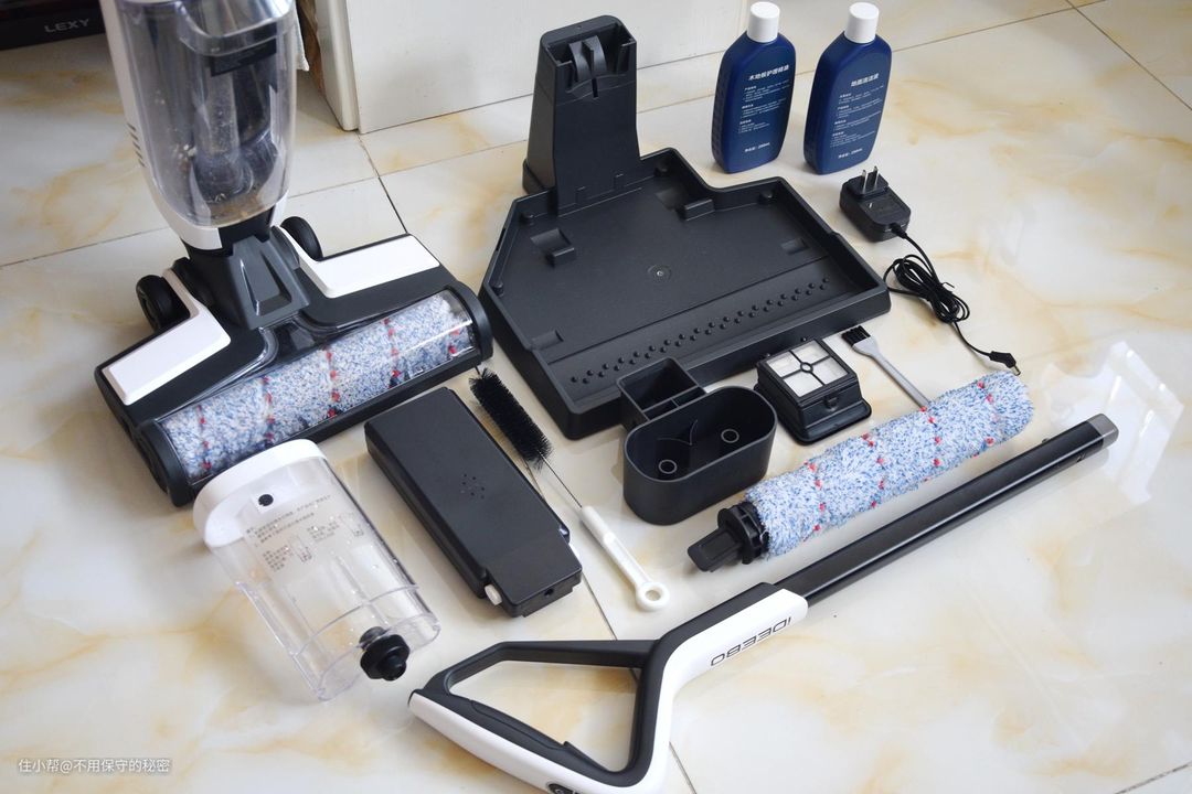 全部备件包括有手柄组件、机身组件、电池、电源适配器、充电底座、附件架、清洁刷、使用说明书、以及两瓶地板清洗液和护理精油。