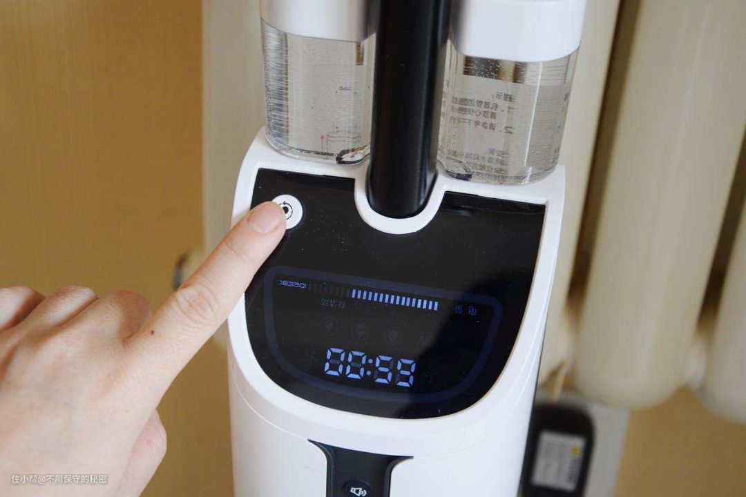 主机顶端是LED屏幕,开机即点亮,实时显示内容很多,比如档力显示、电量、缺水提示、 UVV-C除菌功能显示状态、污水箱满水提示、自清洗功能显示状态等,白色按键为自清洁键。
