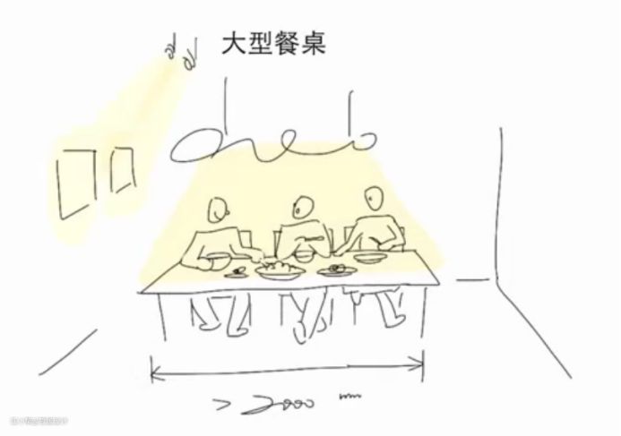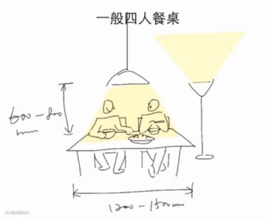 中小型家庭,四人的餐桌,一般长在1200-1500mm。灯具距离桌面在600-800mm,空间窄小的话需要改为射灯