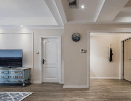 这是偏黄的灰色地板,墙面是浅驼色的硅藻泥或者乳胶漆,再用纯白色脚线、墙线、门线和顶线勾勒出有节奏感的线条,这是典型的和谐色调。家具可以搭配它的对比色—蓝色系,这样就会增加色彩的跳跃感,增加家居环境的灵动感。