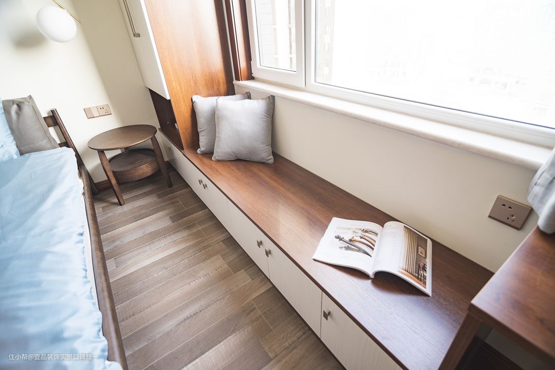 ① 储物型飘窗:如果是可以掏空的,可以改造成储物型飘窗,在飘窗底部做收纳柜。利用飘窗侧面墙壁,因地制宜,扩大收纳空间。