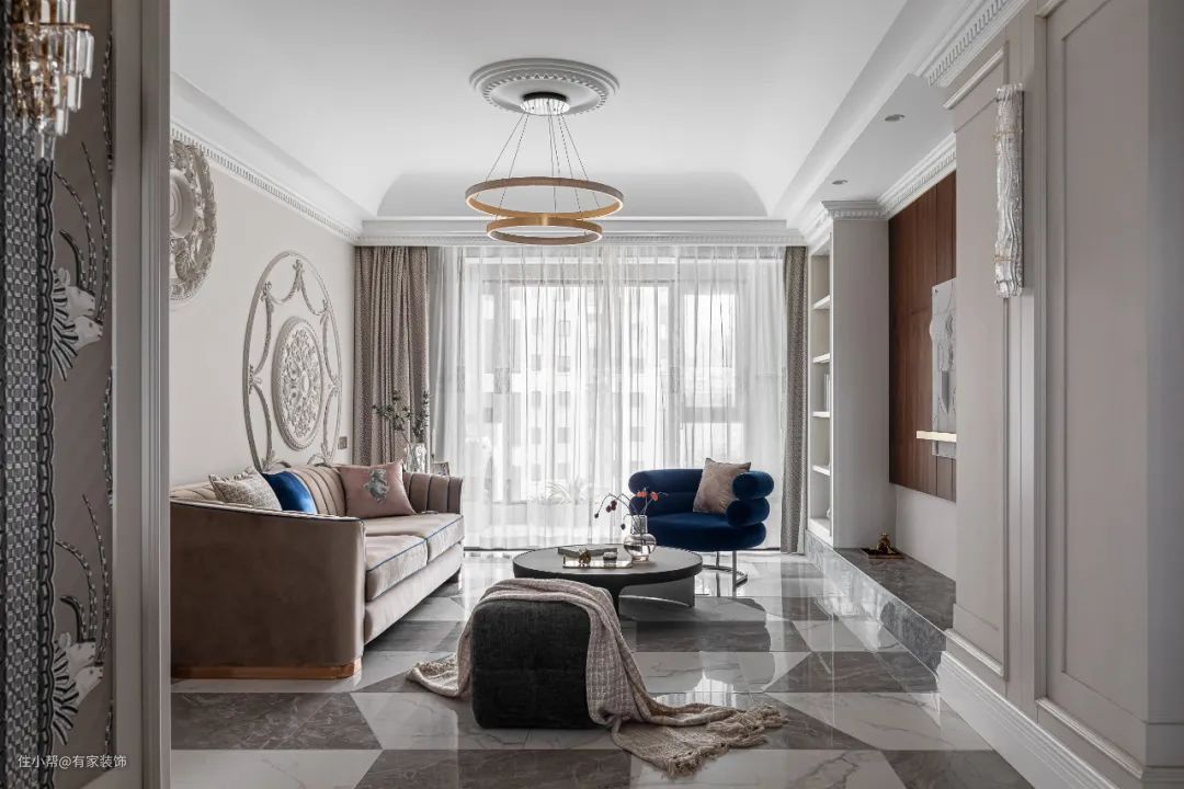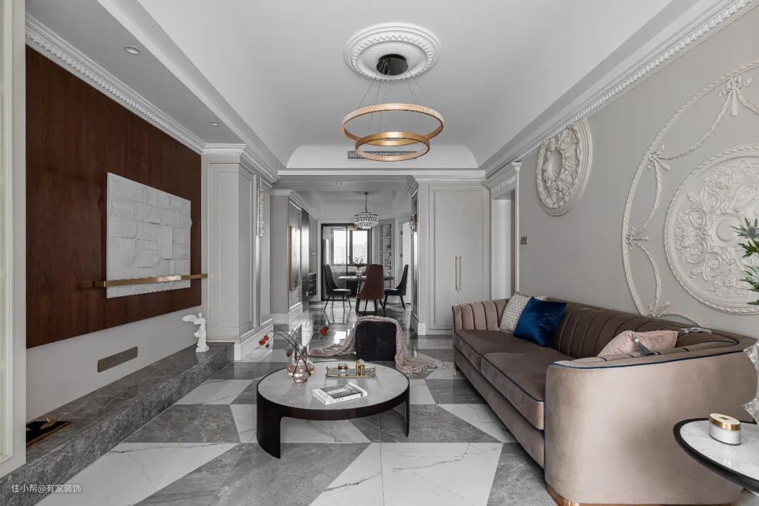 沙发背景墙两幅巨型石膏圆盘无疑是整个家的点睛之笔;整体温润的色调中,添加丝绒和缎面质感的面料,打造典雅轻奢的氛围。