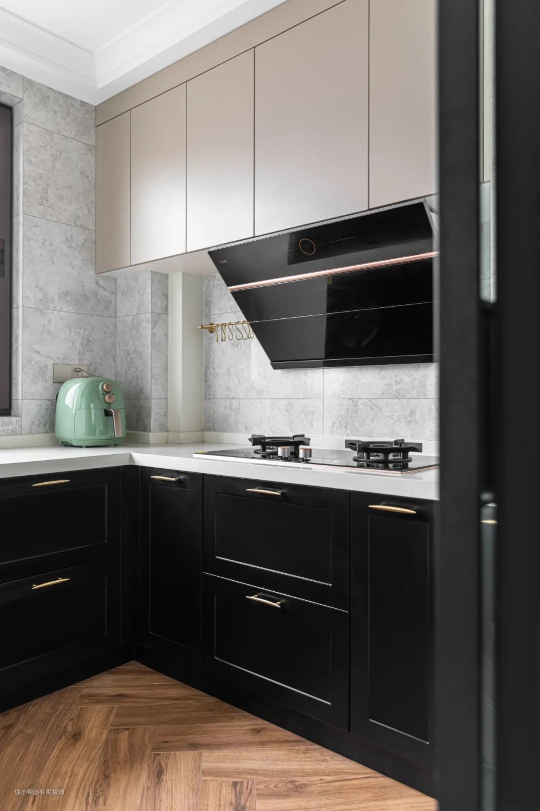 厨房地面采用胡桃木色木纹砖,地柜延用餐边柜的黑色烤漆门板,点缀黄铜拉手;香槟色吊柜门板增添几分时尚与温馨。