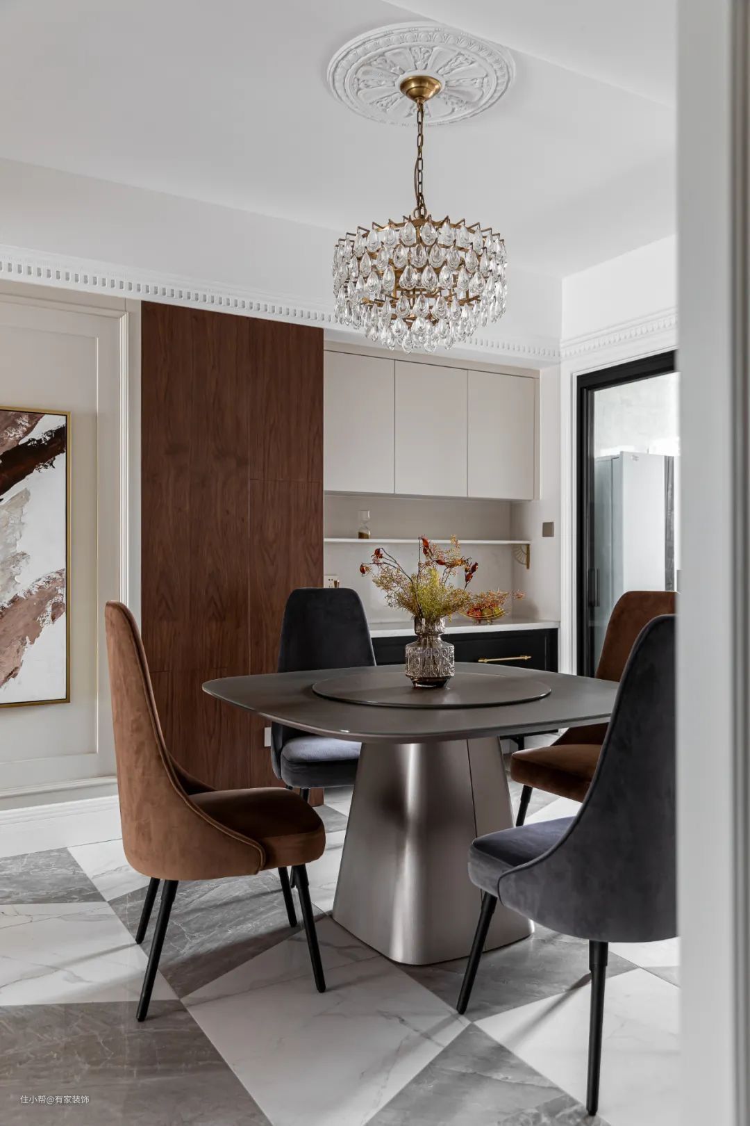 餐厅整体营造一种精致优雅的轻复古风:PU线条、叠级护墙、高踢脚与胡桃木饰面碰撞融合形成餐厅的主背景,也构建出了整个客餐厅的主旋律;石膏灯盘、水晶吊灯、黄铜支架和黄铜拉手第一系列经典的美式元素,与简洁摩登造型的家具融合,既复古又时尚。