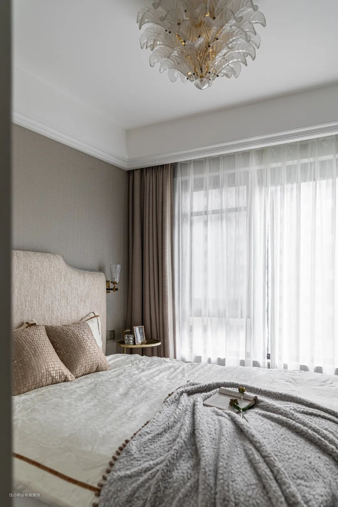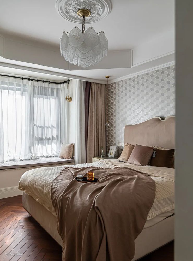 次卧整体浅咖色调,格子肌理墙布与亚麻材质窗帘尽显细腻质感。