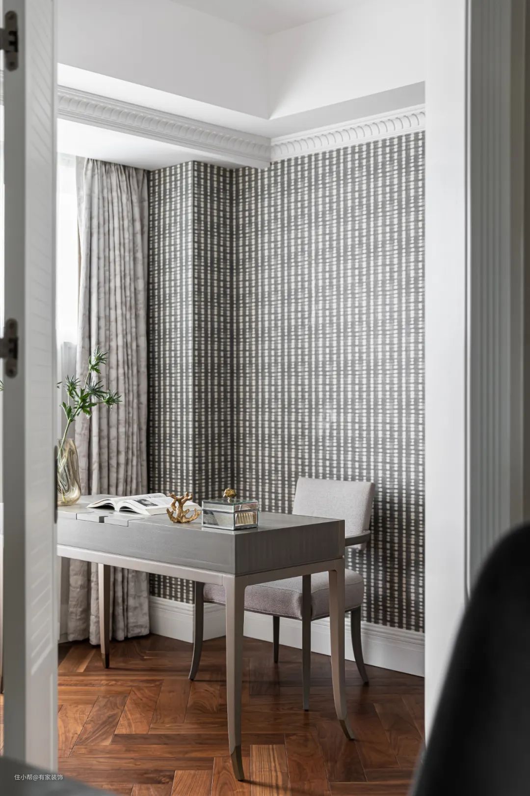 进口斑点图案壁纸、人字拼地板、陈列排布的书架,呈现出一种秩序之美;书架采用奶油色烤漆封板对胡桃木柜体进行分割,打破木色的厚重感;窗帘、书桌、书椅以优雅的灰色调为主,营造沉静复古的书房氛围。