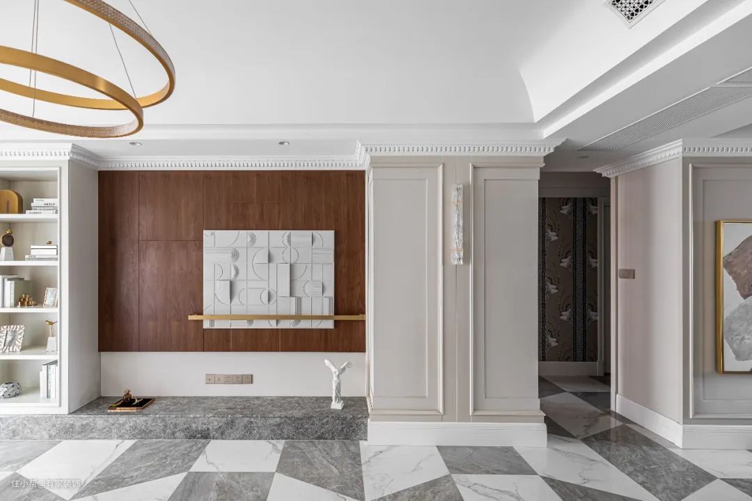 客厅取消电视柜,采用立体几何浮雕画和黄铜挂件穿插,与胡桃木饰面、古堡灰石材地台组合形成客厅的主背景。