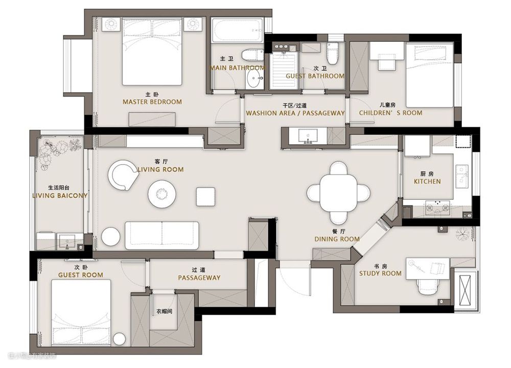 3、原次卫空间较小,利用餐厅墙体内凹,分别形成餐边柜与台盆柜,实现次卫干湿分离。