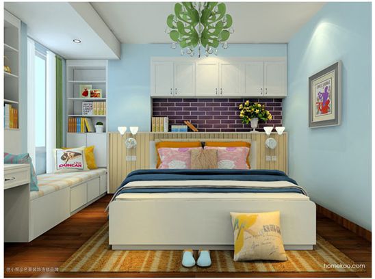 原本床头墙壁是凹凸位比床略宽,看起来很不美观,设计师利用柜体填补。赠设了飘窗休闲区。