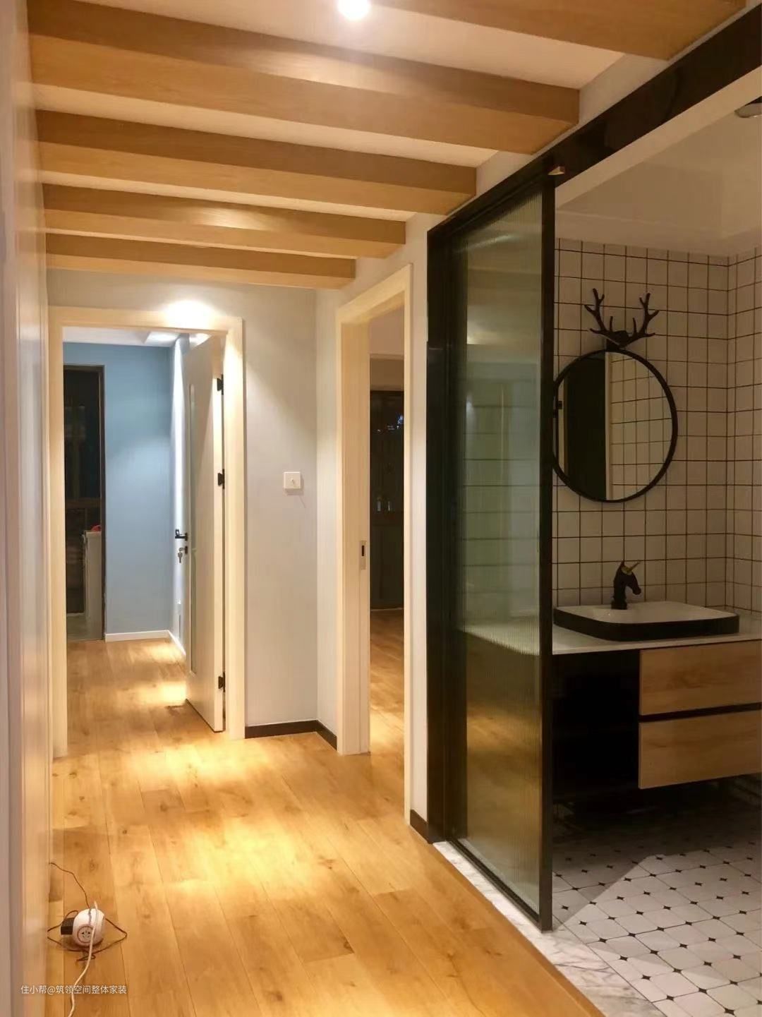 走廊的天花上有比较多的横梁,但是层高不适合吊平顶的情况,也可以考虑采用假梁吊顶的设计,把横梁用木饰面包装起来,然后再增加几个木色假梁设计,让空间的质感更加和谐自然。
