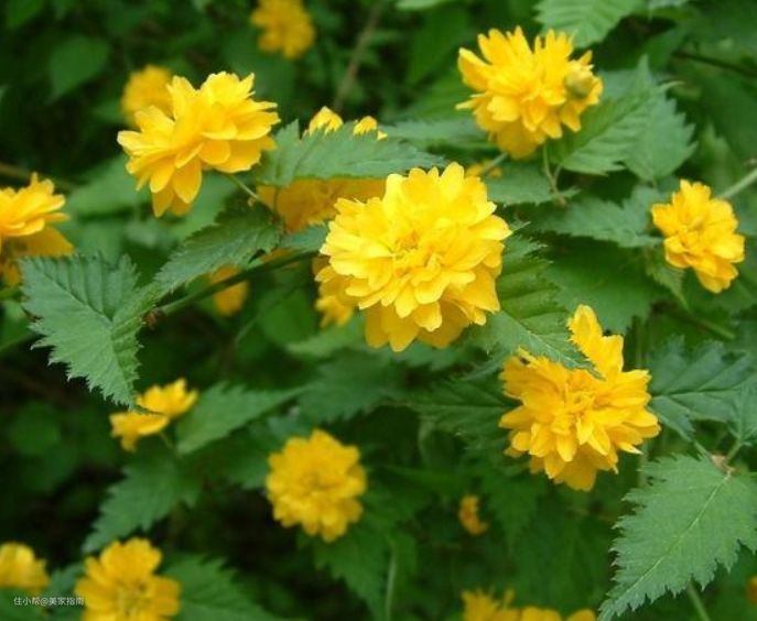 棣棠花花色不多,花瓣有单有双,各有各的美。棣棠花叶片翠绿,与榆树叶片有些相像,植株较大,是落叶灌木品种。花量惊人,盛花期纤细的枝条挂满黄色花朵,几乎不会有不开花的“无用”枝条。