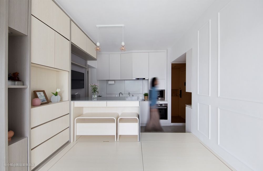 从户型图上看,入户就是厨餐厅,但在进行内部设计时,设计师做出了隔间和转角,让玄关独立出来,并设玄关柜,形成单独的门厅,避免餐厨厅过于直白地暴露。