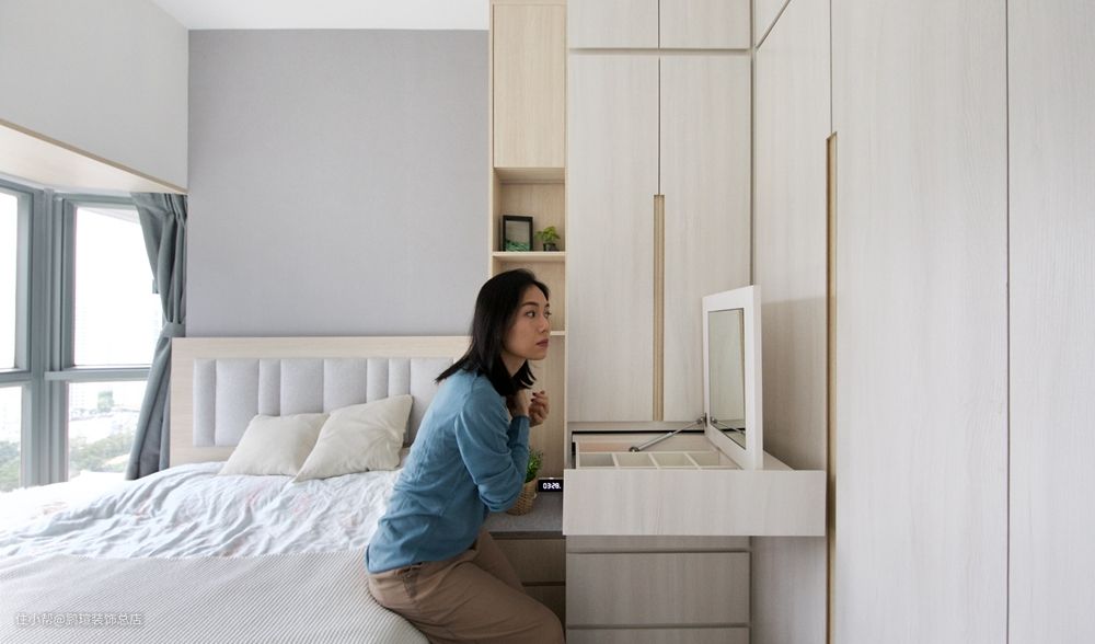 衣柜里隐藏着梳妆台,不用时收起来保持空间清爽整洁,需要时拉出,很方便,内部是方格结构,让化妆用品收纳得更加有秩序。