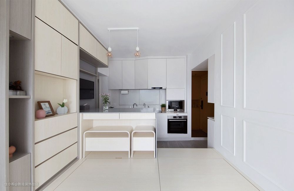 白色调的榻榻米地台不止是地板,隔板拉起是储物柜,从纵向扩充收容空间,轻松解决小户型收纳烦恼。