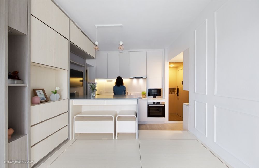 过道右侧是餐厨厅。一改原户型中厨房封闭局促的模样,将厨房外移至与餐厅开放式一体。