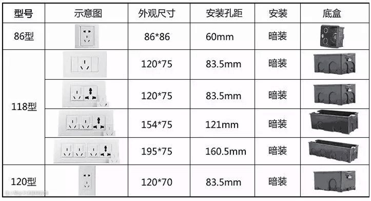 底盒:也叫暗盒,预埋固定在墙内,为后期面板安装打好基础。86型、118型、120型底盒尺寸。