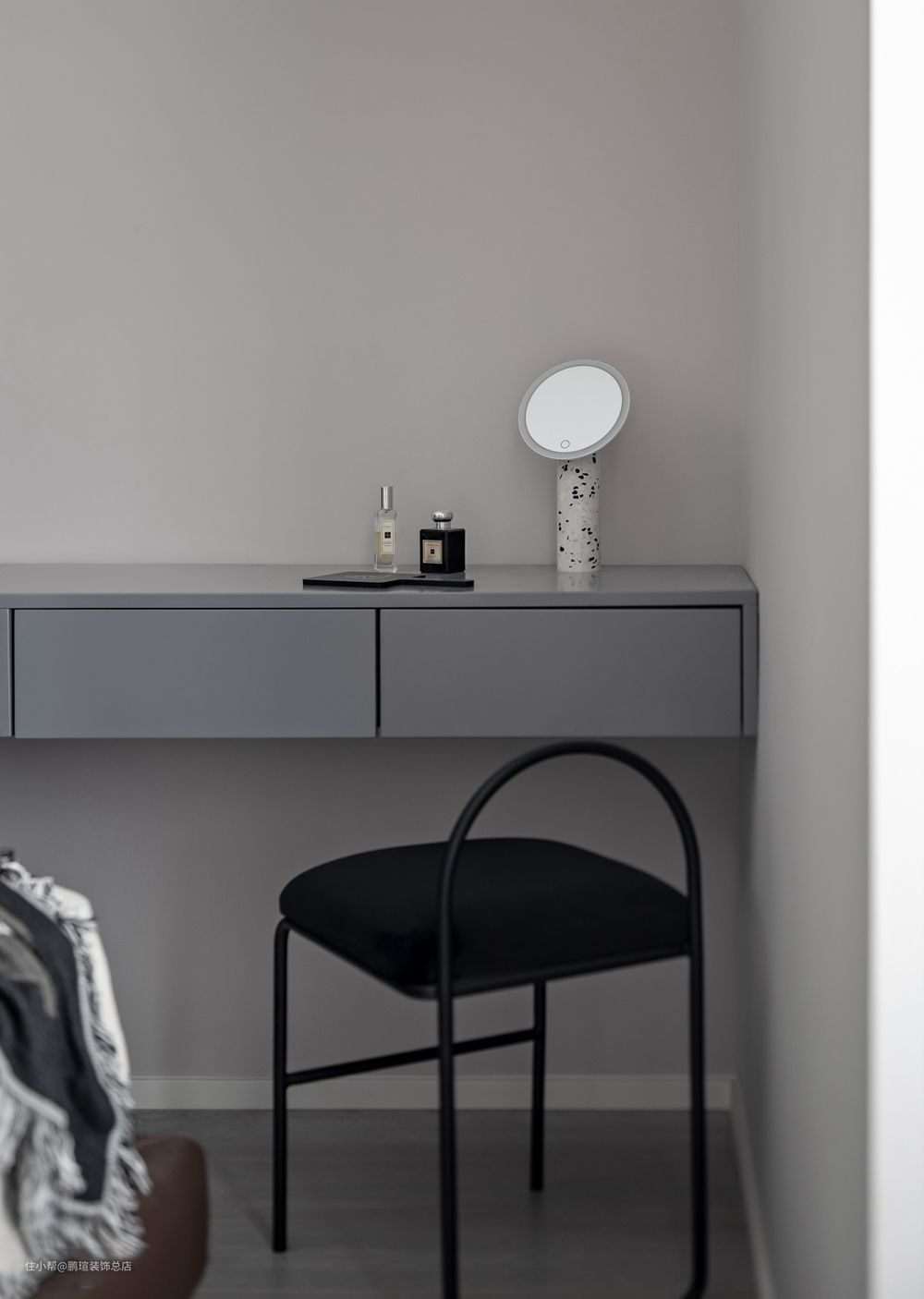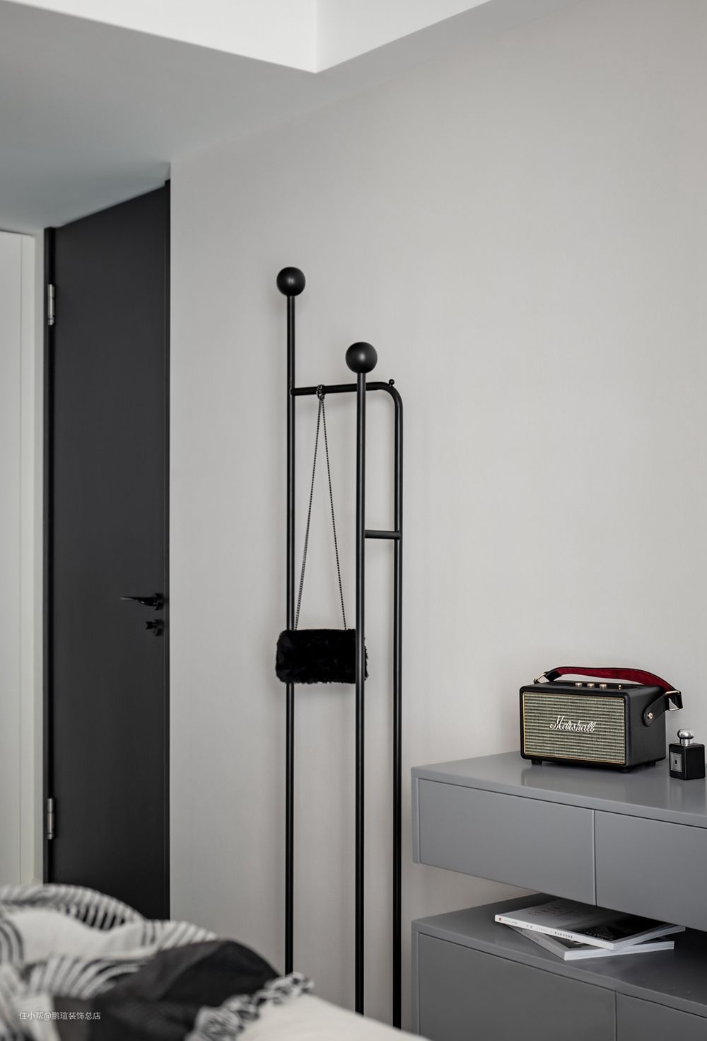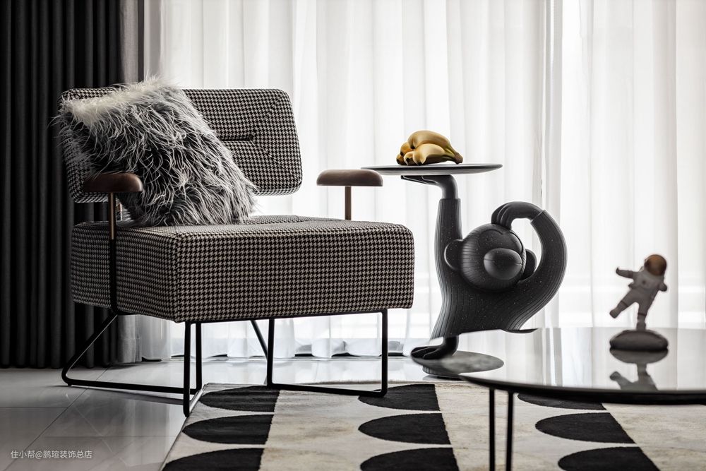 不仅仅是为了营造黑白灰的高级感,其实灯具、边柜、茶几、地毯的选择都是围绕“探月”这一主题,细节之中相互呼应,物品间的连接感营造得很巧妙。