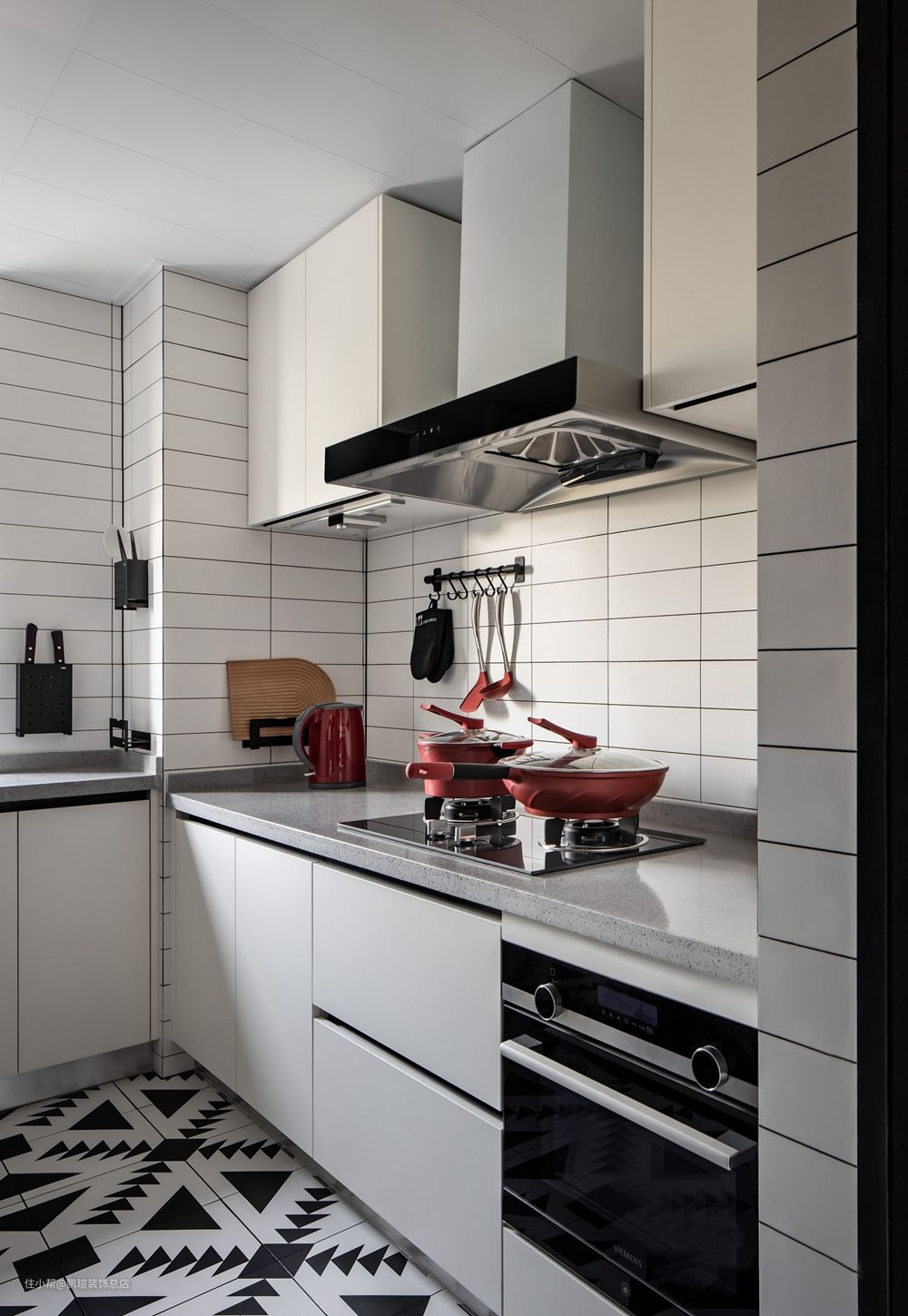 厨房选用白色橱柜,显得干净整洁。墙砖和地砖在考虑实用的同时兼顾美感,经典的黑白线条、几何图形搭配简单利落,丰富空间氛围。