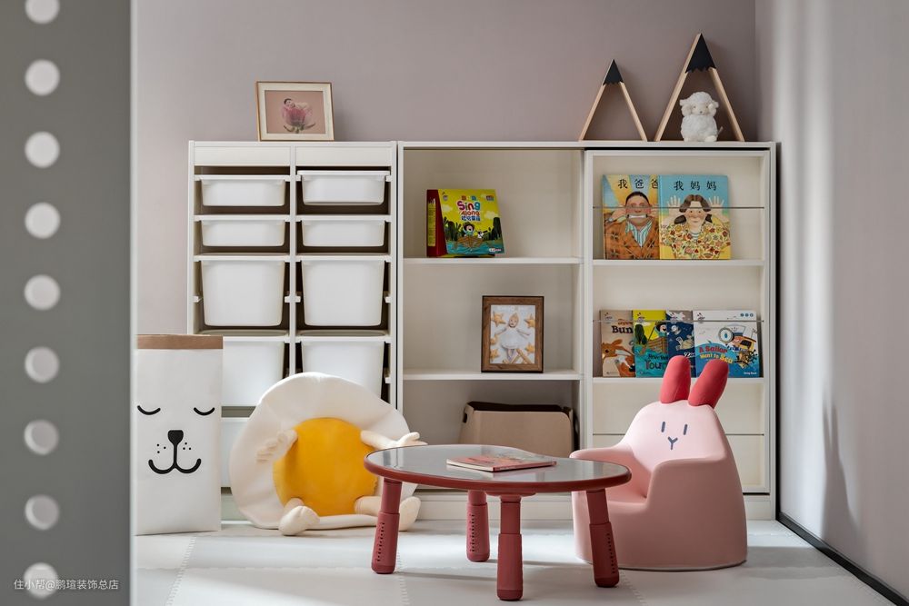 游戏房是一个灵活度很高的空间,既能用来储物,又能让孩子在此玩耍,以后可以考虑用作客房。目前设计了一组收纳高柜,将宝宝的衣物和玩具尽收纳于此。