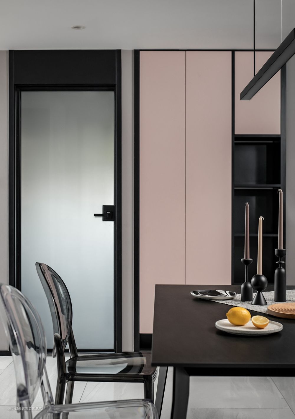 1-女主人甜美可爱,粉色特别能凸显她的特质,而黑色又代表男主人的冷静酷帅,这样的配色一定程度上是业主夫妇性格的融合。